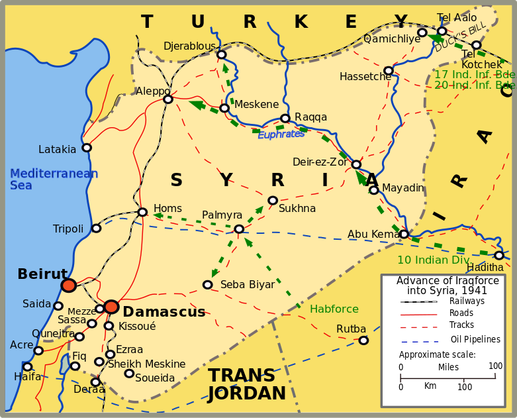 The Vichy forces in Syria greatly outnumbered Britain’s Middle Eastern forces in men and aircraft, particularly after they transferred a couple of hundred aircraft from France and French North Africa, but a couple of things worked in the Allies’ (the Free French army participated as well) favor. For one thing, Britain controlled enough of the Middle East to attack Syria from Palestine in the south and from Iraq in the east simultaneously, and the Allies made the most of this by dividing their forces into four columns that would each strike at different spots. Two units advanced north from Palestine to take Beirut and Damascus, while two more attacked from Iraq, one heading toward Palmyra and the other to Aleppo via Raqqa. The air war also went very well for the Allies, in that the vastly outnumbered British air force was able to destroy much of the French air force on the ground, where its numbers advantage didn’t matter. Finally, for whatever reason, Germany never sent any substantial assistance to Syria, possibly due to disagreements with Vichy French commander Henri Dentz, who declined even the marginal aid the Germans did offer.