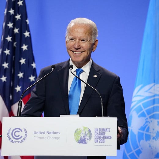 Biden’s airing of the grievances (well, grievance) aside, if you could siphon carbon out of the atmosphere simply by criticizing Beijing, this conference would be doing fantastic work on humanity’s behalf. This criticism is fueled by a Chinese emissions reduction plan that is, in truth, inadequate to the crisis. It doesn’t phase out coal fast enough, it doesn’t commit to “net zero” emissions (for whatever that dubious concept is actually worth) soon enough, etc.